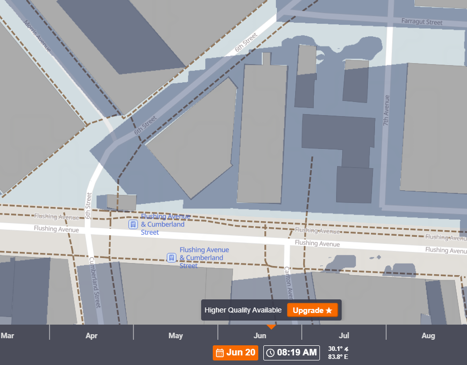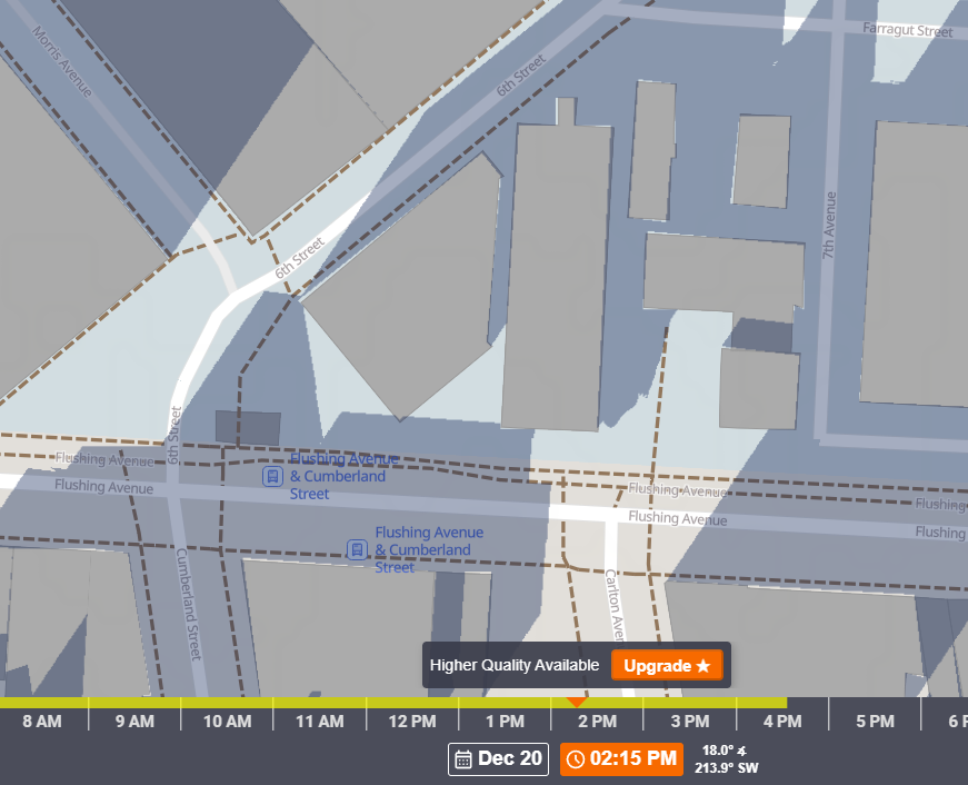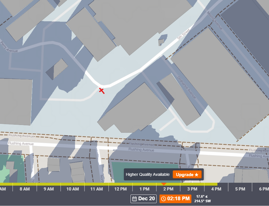 Lets look at the location in front of our office in New Lab in the Brooklyn Navy Yard in June (summer solstice) and December (winter solstice). A quick look on Google Maps and you’d think it looks ok. Nearby buildings aren’t particularly tall and the street is fairly wide.