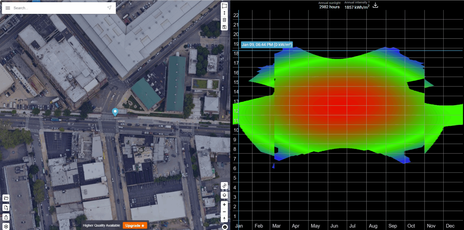 To take it to the next level, you can even show the solar intensity at the location. It doesn’t account for panel angle or rotation, but will provide a numeric value to back up the more visual shading feedback from the tool. This location next to our office receives 1776 hours of direct sunlight a year.