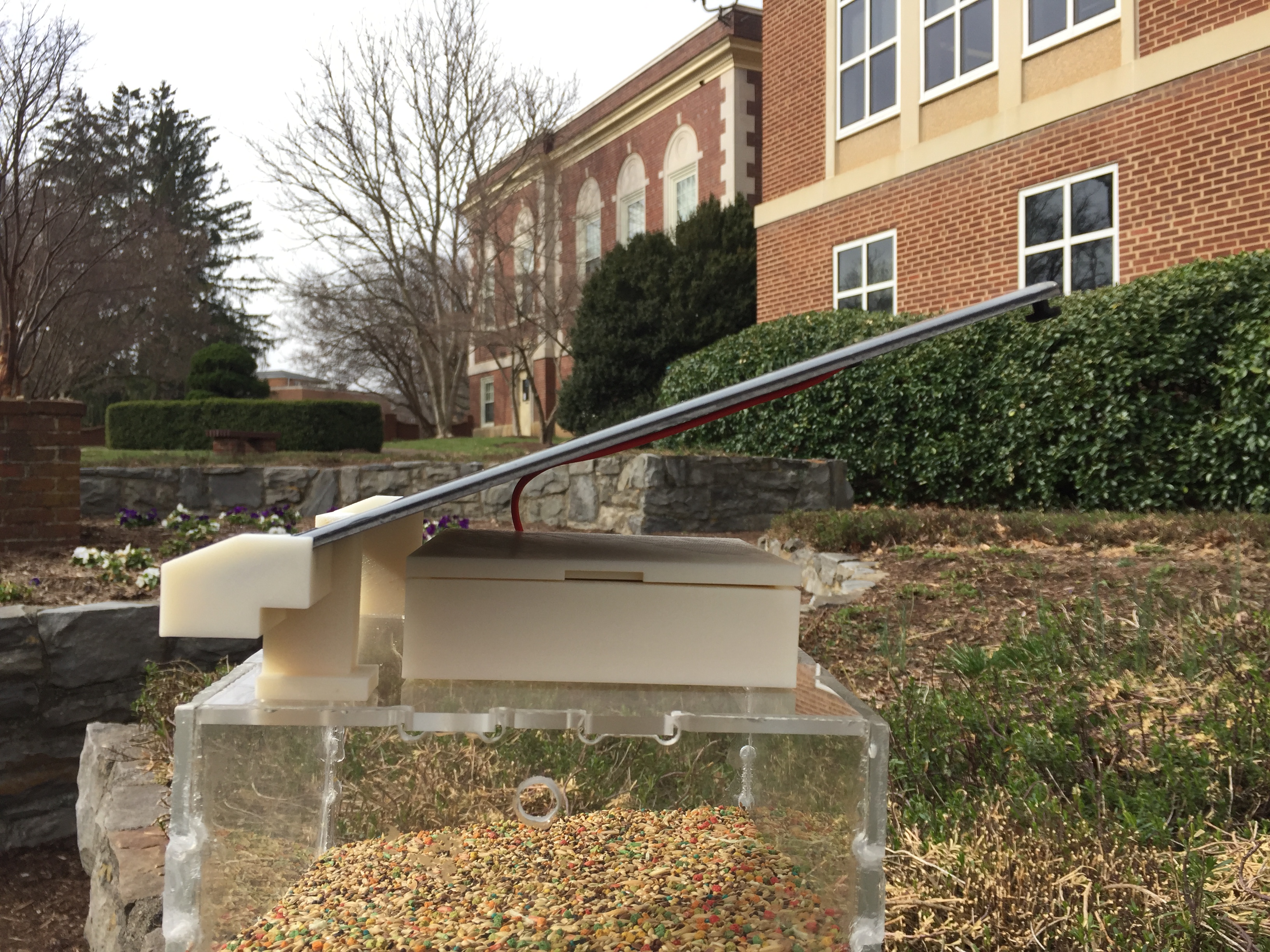 When placed in an urban habitat, buildings often shade the solar panel and reduce power production. The first location of our feeder was on Radford University’s campus between two 5 story buildings. On a sunny day, this was no problem as the solar panel received enough sunlight to fully recharge the battery. With repeated cloudy days, the battery wouldn’t always receive enough power to survive. This is a situation where increasing the battery size, or linking multiple batteries together would be helpful as a buffer to outlast the bad weather.
