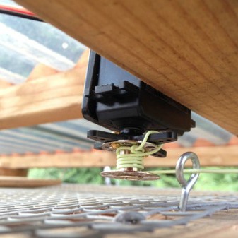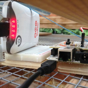 The system is powered by our 3.4 Watt solar panel and V15 battery in Always On Mode. Ian uses a Beagle Bone to drive servo motors to open and shut the door and a timer to shut the system on and off. The timer is the critical part of the system as it dramatically cuts power usage and allows everything to run on a relatively small panel.