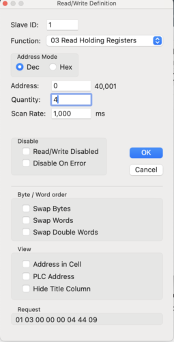 0x01 0x03 0x00 0x00 0x00 0x04 0x44 0x09
