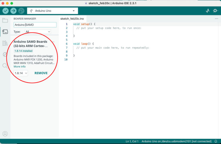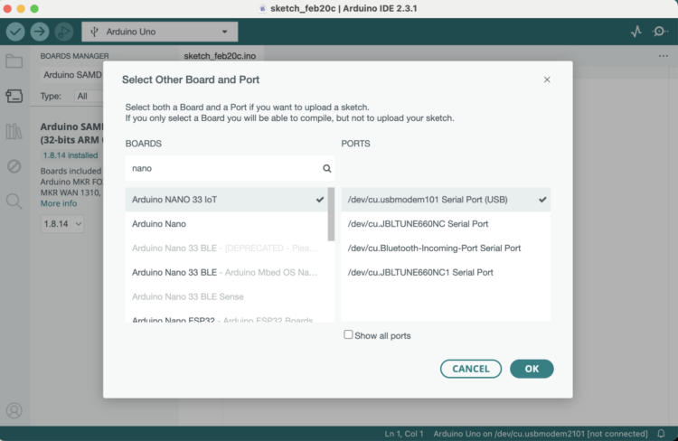 - Select the board and port by clicking on the triangle in the box next to the debug icon: