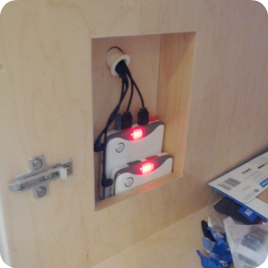 Batteries: We decided to run the four panels to the two V39 batteries wired in parallel, so that one wire from the panels was split to go to both batteries. That way, whatever power was generated by the panels would go to whichever battery could absorb it. From there we would run wires to the lights. We hacked a couple of our 3 or 4 panel circuit boxes to get 5.5×2.1mm male plugs and joined these to the copper wire we had fed through the window frame. This could as easily be done with the “power out” wires from our 2 panel circuit box and a 5.5×2.1mm adapter. We connected the plugs to the batteries and saw the LEDs on the batteries light up indicating they were charging and the circuit was good. The Life Edited carpenter later made a custom nook for our batteries inside the closet by the bed, which seemed the right place for charging a phone or tablet.