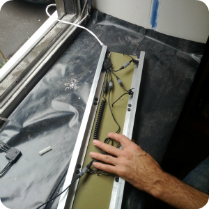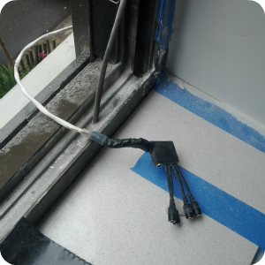 Panel Installation: With that done, we were ready to install the solar array on-site. We hacked one of our 4 panel circuit boxes, and attached the output wire to some electrical wire. We then fed the wire into the apartment through an existing hole in the window frame. Our 2 panel circuit boxes could be used here (with two 6-W kits), but the 4 panel option was cleaner.