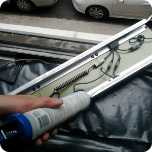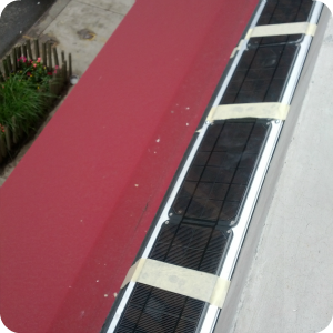 We could have just secured the strips directly to a substrate, however we didn’t want to screw into the flashing (since that would undermine its waterproofing), so we took the additional step of attaching two strips of aluminum U-channel (3/4” each side) which provided a flat even surface to secure to the flashing with silicone. This created a space under the panels for the circuit box and wires, reduced the likelihood of water backing up, and makes it easy for us to remove the panels for service without having to cut the silicone connection. The U-channels were cut to length and attached with self-tapping screws to the 1” strips.
