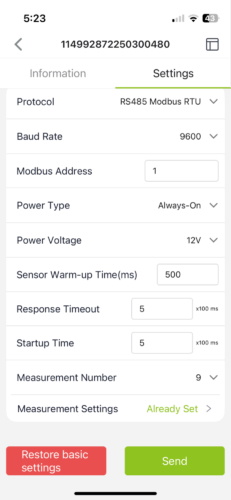 Under “Sensor Settings”, select RS485 Modbus RTU for “Protocol” and a baud rate of 9600. Set the Sensor Warm-up Time, Response Timeout, and Startup Time to 500 ms.