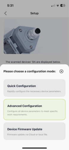 Once the LED is blinking, press “Device is ready for configuration” in the app. Then press the appropriate serial number in the app, and press “Advanced configuration”.