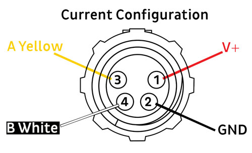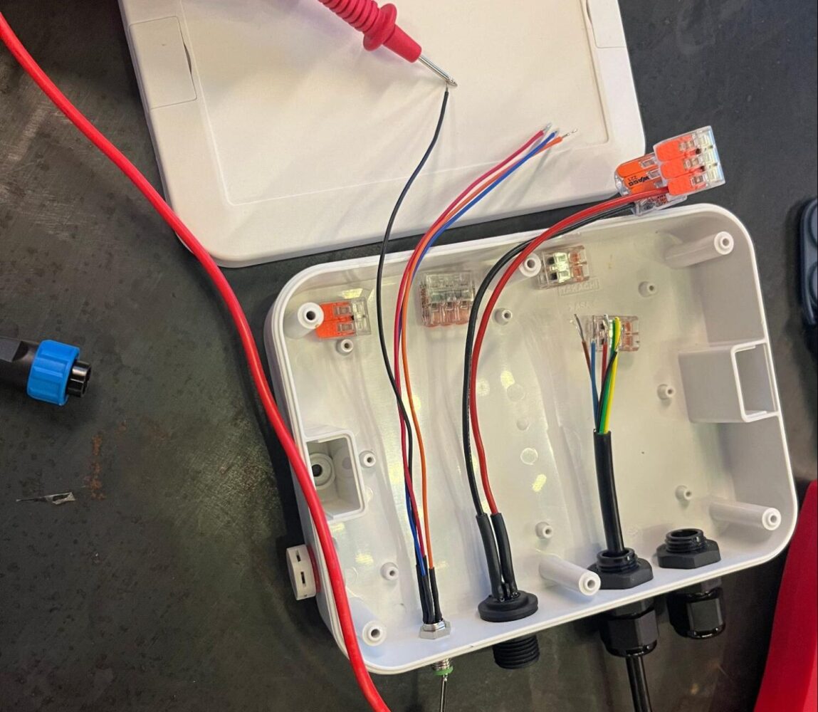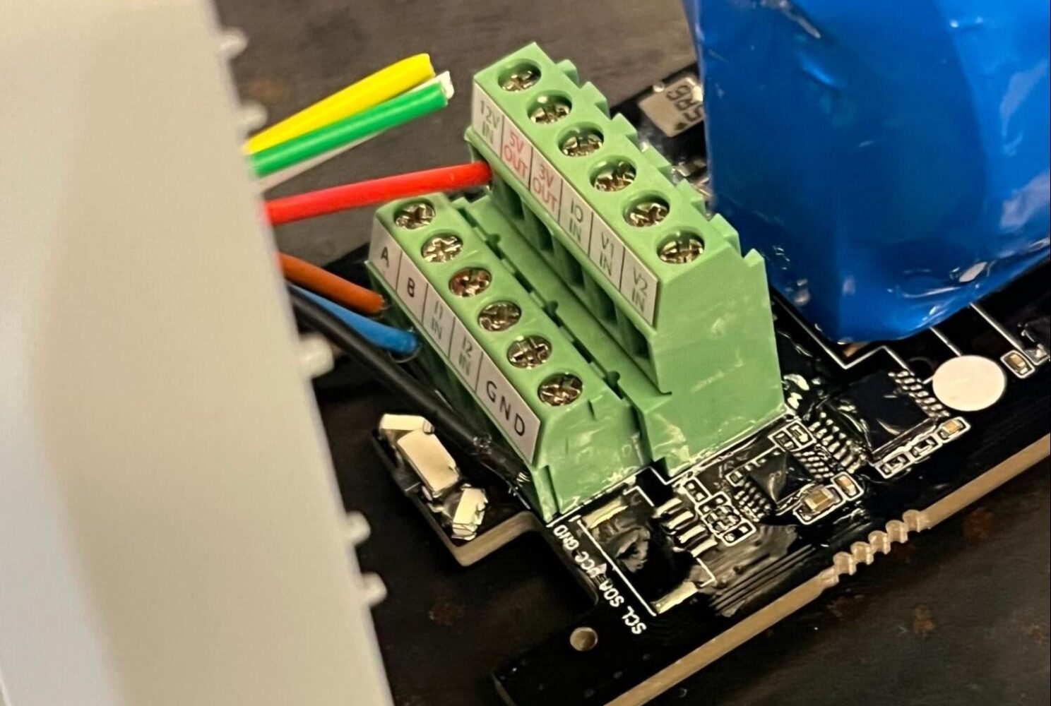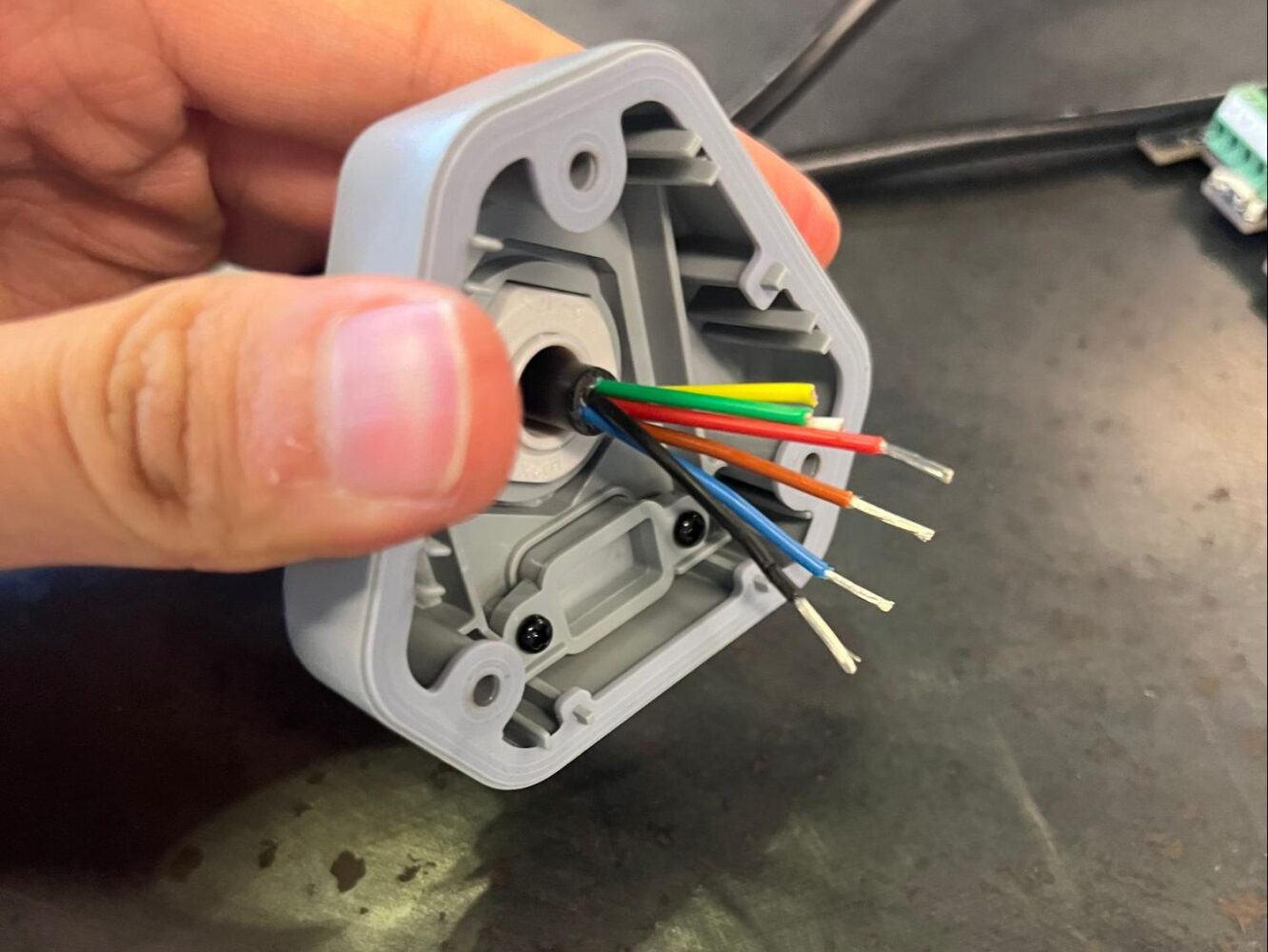 You should see screw wire terminals exposed. Feed a stripped M8 cable through the cover, and connect wires to the “12V IN”, GND, A-, and B+ terminals, using the same colors as in the battery M8 cable. (Note that in the photo below an M12 cable is used, so it has two extra wires, which are unused. You can use any cable that will fit and has four accessible wires.)