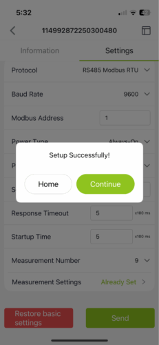 Once you are done inputting the Measurement settings, go back to the main settings screen and press the Send button at the bottom of the screen. You should then see a dialog that says “Setup Successfully!”