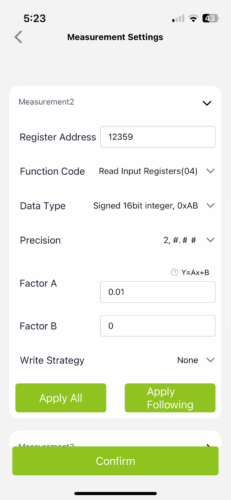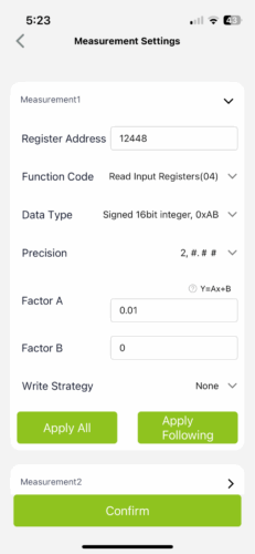 Since all of the measurements except Battery Status have a multiplier of 100 units and use the same function code, we can click “Apply All” to apply these settings to the following eight measurements.