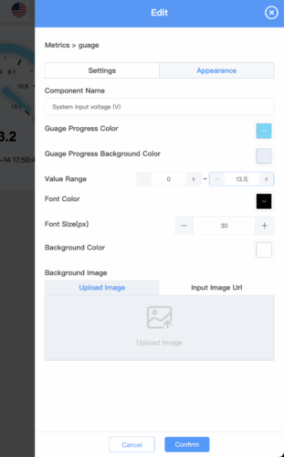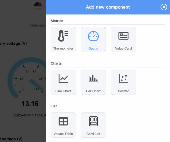 To display this data in a more readable way, go to the Panel page in the sidebar, and click Add New Panel. Give your panel a name, then you are ready to add components to display your data. There are many options available for displaying your data. For example, let’s set up a gauge to display voltage data.
