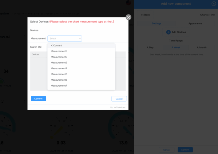 When creating the new component, click Add Devices, and then select the measurement you want to plot in the dropdown menu. This will bring up the data logger and allow you to select its corresponding data output to plot.