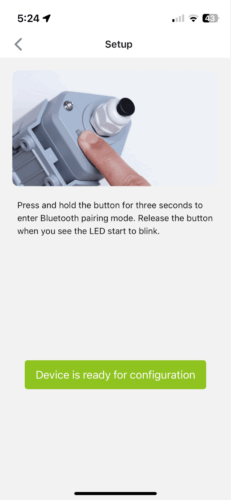 After the device is added, select “Device Bluetooth Configuration.” When you see the “Setup” screen, press and hold the button on the data logger for three seconds. You should see the LED start to blink green.