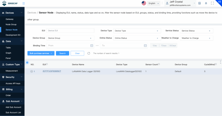 Each Voltaic CORE battery has an RS485 Modbus connection which allows users to monitor battery voltage and current output, solar panel voltage and current input, and temperature. It is relatively straightforward to bring that data into Seeed Studio’s Sensecraft App.