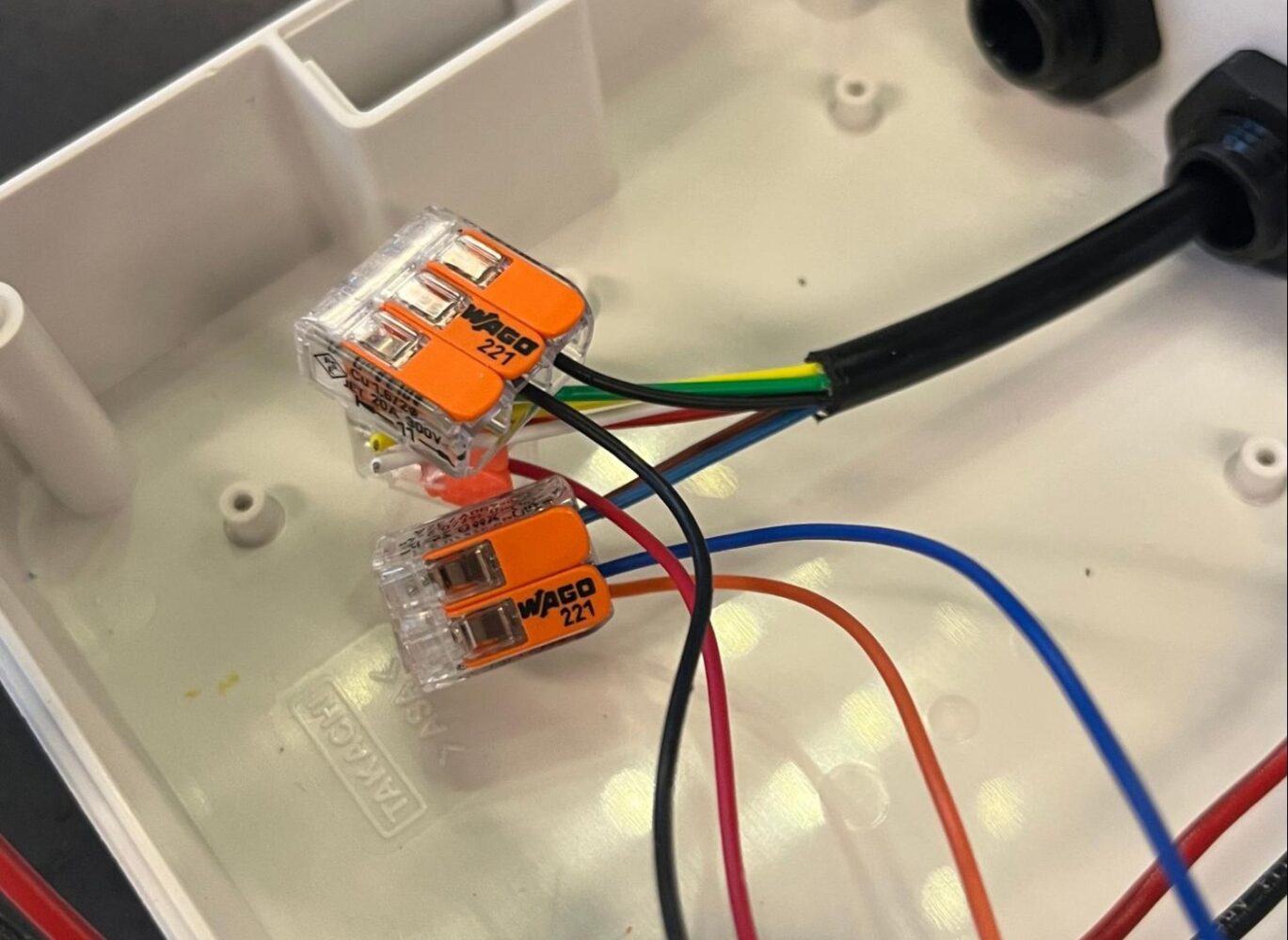 Connect each of the corresponding wires to each other (A+ to A+, B- to B-, GND to GND, V12IN to V+), matching the colors from the earlier steps. You can solder them or use any wire connector; in this tutorial we’re using Waygo quick connectors with levers.