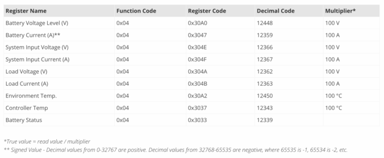 In the Measurement Settings screen, we are going to set up measurements based on the Charge Controller RS-485 Guide on the Voltaic Systems website. Specifically, we are going to reference this table: